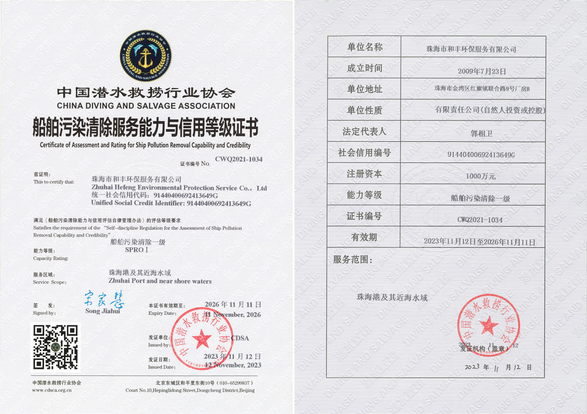 導(dǎo)語(yǔ):珠海市和豐環(huán)保服務(wù)有限公榮獲司中國(guó)潛水救撈行業(yè)協(xié)會(huì)《船舶污染清除服務(wù)能力與信用等級(jí)證書(shū)》,獲得船舶污染清除一級(jí)證書(shū),服務(wù)區(qū)域覆蓋珠海港及其近海水域,為珠海環(huán)境保護(hù)服務(wù)增添新動(dòng)力。 |